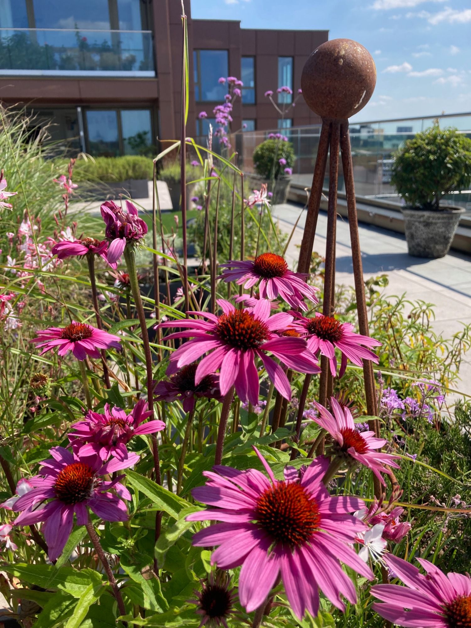 Careful plant choices that tolerate the heat of summer to sing with colour in autumn, like this hot pink Echinacea